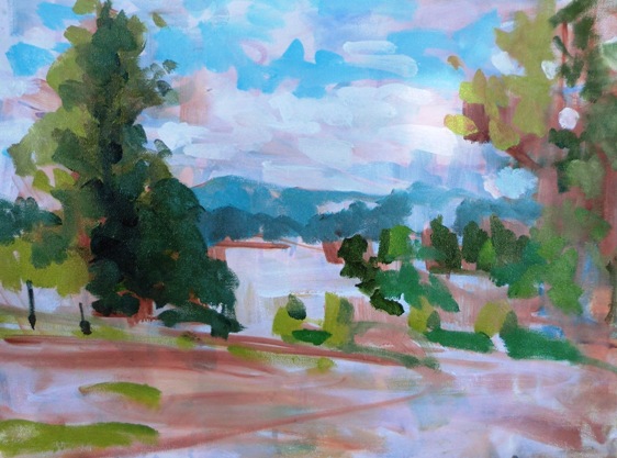 Sometimes the "sentiment of/for truth" (verismo or il vero) demands complexity of form wherein the scene itself is very complex with overlapping forms and directional lines. Here a large park with its paths and distant hills provides the opportunity. But working "al aperto" (in the open air), one has to work quickly as the changing light first reveals and then conceals forms that exist only for as long as the light that falls upon them.